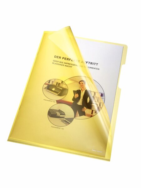 Aktenhülle, A4, PVC, 150my, gelb oben und rechts offen, glatt VE = 1 Packung = 100 Hüllen Griffausstanzung, Maße: 220 x 310