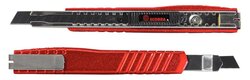 Produktinformationen "Cutter Premium 9 mm Klinge Schieberaster mit 4-Punkt-Arretierung Rechtshänder Metallgehäuse rutschhemmender Griff inklusive 2 Ersatzklingen rot"