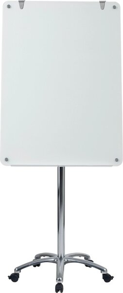 Flipchart Glas weiß Einbeinstativ, Sternfuß mit 5 Rollen Tafelfläche (H x B) 100 x 70 cm Glastafel beschreibbar, Ablageschale Gestell und Sternfuß, silber Gewicht 12 kg Blockhalter Made in EU / Hergestellt in Europa