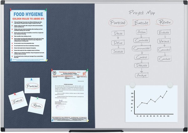 Kombitafel Filz/magn. 120x90cm grau glatte graue Filzoberfläche magnetisch, trocken abwischbare Tafel eloxierter Aluminiumrahmen, inklusive Wandmontageset Made in EU / Hergestellt in Europa