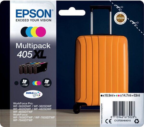 Multipack DURABrite 405XL, 4 Farben für WorkForce WF-7830DTWF/WF-7835DTWF 1 Multipack = 4 Tinten WF-7840DTWF/WF-3820DWF/WF-3825DWF/ WF-4820DWF/WF-4825DWF/WF-4830DTWF/ WF-7310DTW Inhalt: schwarz, cyan, magenta, gelb 1x 18,9 ml und 3x 14,7 ml