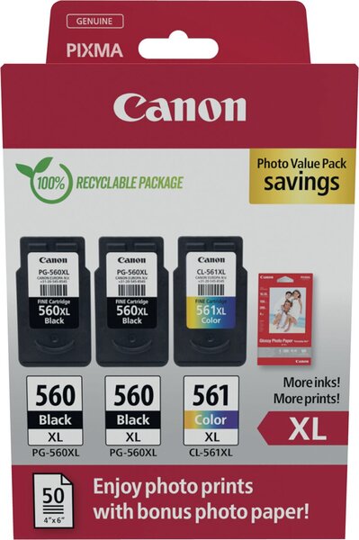 Multipack PG-560XLX2/CL-561XL Photo 2x PG-560XL schwarz, 1x CL-561XL color 10x15 cm Photo Paper (GP-501 50 Blatt) für Pixma TS5350, TS7450i, 14,3ml x 2 +12,2ml