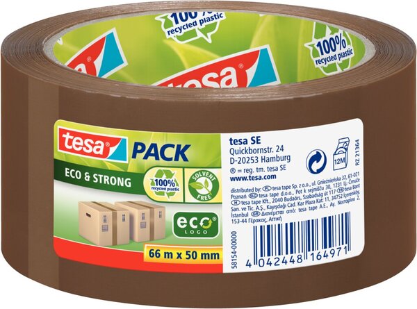 Packband tesapack Eco & Strong 50mm x 66m, braun Trägerfolie aus 100% recyceltem Kunststoff, Kern aus 100% recyceltem Karton.