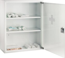 Verbandschrank Erste-Hilfe aus Stahl weiß lackiert Glastür 2 Schlüssel 2 Einlegeböden 450 x 360 x 150 mm